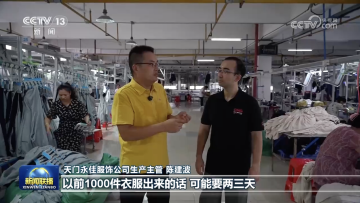 天門永佳服飾公司生產(chǎn)主管 陳建波:以前1000件衣服出來(lái)的話,可能要兩三天,現(xiàn)在1000件衣服從早上掛片,我兩個(gè)小時(shí)就可以出到成品。