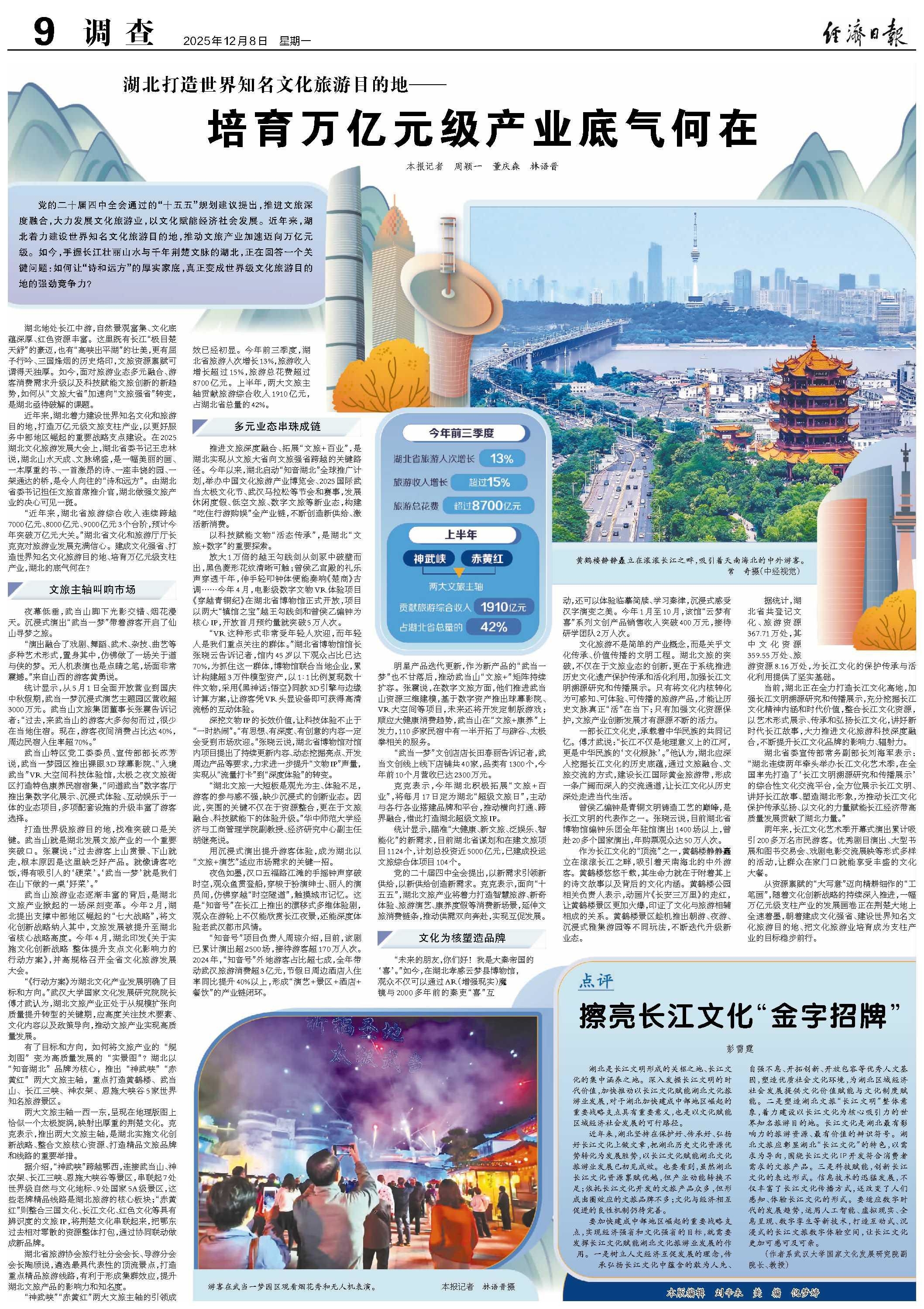 黨的二十屆四中全會通過的“十五五”規(guī)劃建議提出,推進(jìn)文旅深度融合,大力發(fā)展文化旅游業(yè),以文化賦能經(jīng)濟(jì)社會發(fā)展。近年來,湖北著力建設(shè)世界知名文化旅游目的地,推動文旅產(chǎn)業(yè)加速邁向萬億元級。如今,手握長江壯麗山水與千年荊楚文脈的湖北,正在回答一個關(guān)鍵問題:如何讓“詩和遠(yuǎn)方”的厚實家底,真正變成世界級文化旅游目的地的強(qiáng)勁競爭力?