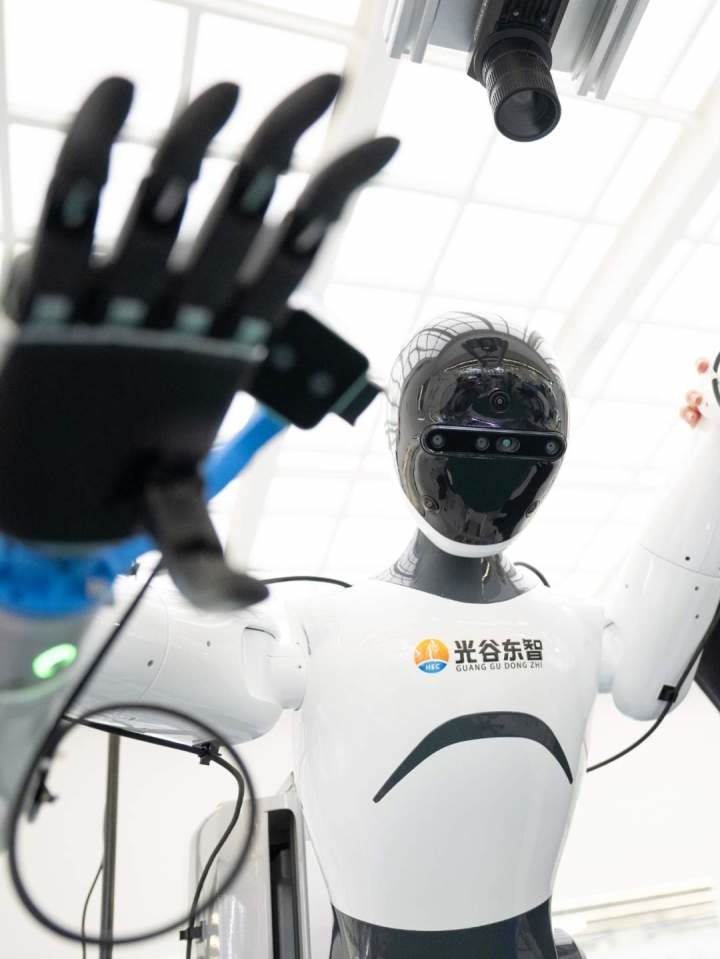 在湖北人形機(jī)器人創(chuàng)新中心,人形機(jī)器人正在進(jìn)行調(diào)試。新華社記者肖藝九 攝