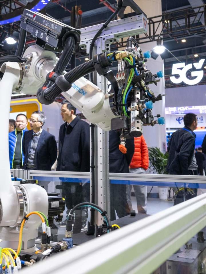 2025中國5G+工業(yè)互聯(lián)網(wǎng)大會(huì)在武漢舉辦,參觀者觀看一款柔性制造島式工作站。新華社記者肖藝九 攝