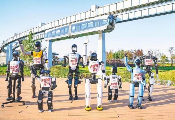 11月4日,光谷中央生態(tài)大走廊,“天問”(后排右一)等8臺人形機器人齊聚一堂,為光谷馬拉松助威。這8臺高矮各異的機器人來自5家光谷企業(yè)和高校,都已經(jīng)具備高質(zhì)量運動能力。(湖北日報全媒記者 魏錸 攝)