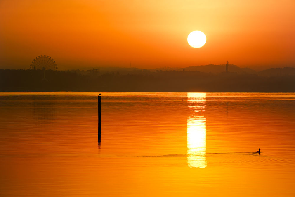 12月14日在武漢市東湖風景區(qū)拍攝的日出。新華社記者 沈虹冰 攝 11月22日在武漢市東湖風景區(qū)拍攝的晚霞。新華社記者 沈虹冰 攝