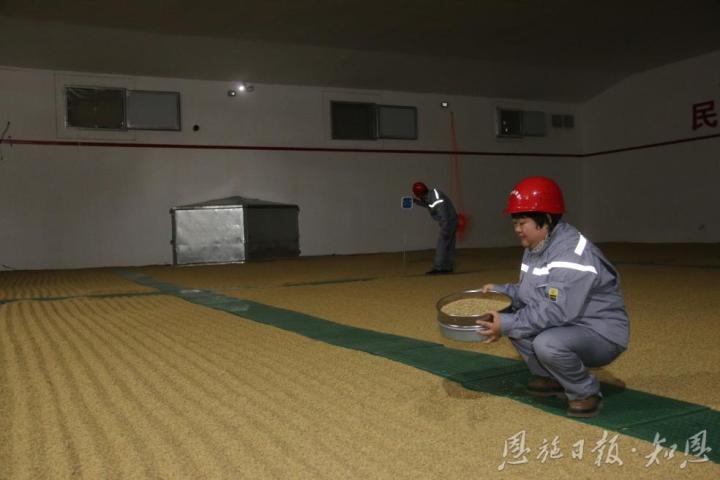 公司員工正在查看糧倉(cāng)里面糧食的情況。(全媒體記者曾維明攝)