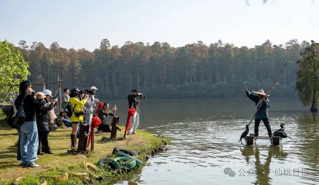 大V們漫步農(nóng)耕文化一條街,觀摩辣椒、花生、玉米等農(nóng)作物,感受豐收的喜悅;駐足欣賞沔陽雕花剪紙的精巧技藝,觀看省級非遺代表性傳承人閔明輝手持大鼓的精彩演繹。乘一葉輕舟,駛?cè)肴鐗羲苹玫乃仙郑善嫉褂乘?,楓葉點(diǎn)綴其間,宛如一幅流動的秋日畫卷?!白哌^全國不少地方,從沒見過這么大面積的水上池杉林,坐船穿梭其中,隨手一拍都是大片,像掉進(jìn)了童話里!網(wǎng)絡(luò)大V“圈圈”滿眼興奮。水上婚禮的巧妙融入,更為這片意境增添了濃厚文化氣息?,F(xiàn)場再現(xiàn)老沔陽漁民“以船為家、日出而作” 生活場景的演繹,將水鄉(xiāng)民俗的獨(dú)特韻味展現(xiàn)得淋漓盡致。
