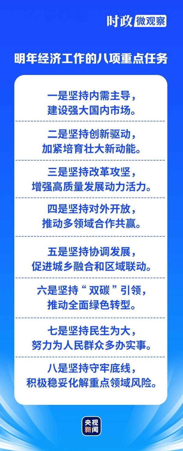 此次中央經(jīng)濟工作會議確定的明年經(jīng)濟工作重點任務(wù),包括“堅持改革攻堅,增強高質(zhì)量發(fā)展動力活力”“堅持對外開放,推動多領(lǐng)域合作共贏”等。