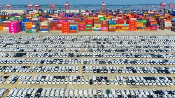 △江蘇省港口集團南京港龍?zhí)陡蹍^(qū)準(zhǔn)備裝船出口的汽車